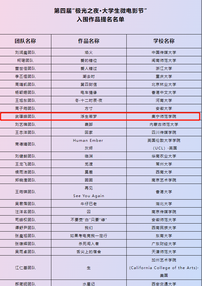 11月1日,由合肥市文化和旅游局、安徽巢湖经济开发区管委会与巢湖市人民政府、合肥易舍传媒有限公司联合主办的第四届“极光之夜大学生微电影节”落下帷幕,来自全球华人大学生的400余部作品中,经过专家组考察和研究下,共选出45部提名入围作品,其中现代服务学院由青年教师宝力、庄悦指导,18级播音与主持艺术班武璟皓、隋亚东、辛舒畅主创,19级播音与主持艺术班:王金雨、张燕峰、李明洋、王杰参与制作的微电影《浮生若梦》成功入围。此次比赛全区共入围两项。