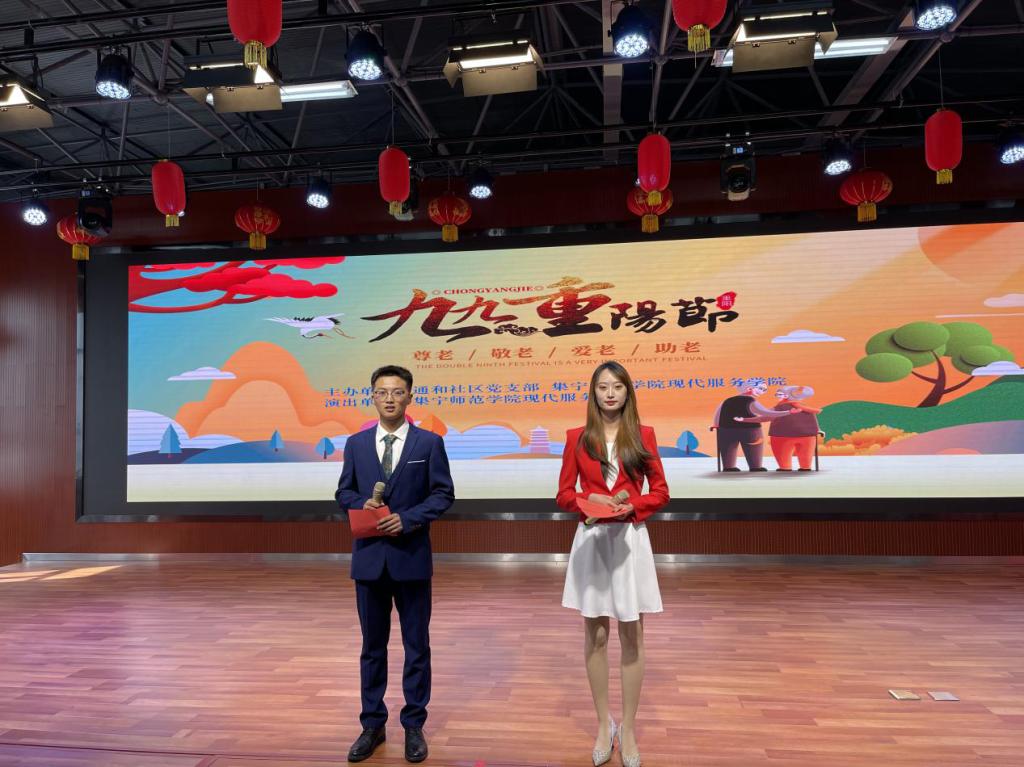 现代服务学院的同学们带来《天边》、《明天会更好》等歌曲,《扇舞丹青》、《鸿雁》等舞蹈,《丰碑》、《将进酒》等朗诵,节目形式多样,内容丰富,为老人们带来欢乐的同时,也丰富了大家的精神生活,同学们陪老人欢度节日,其乐融融。