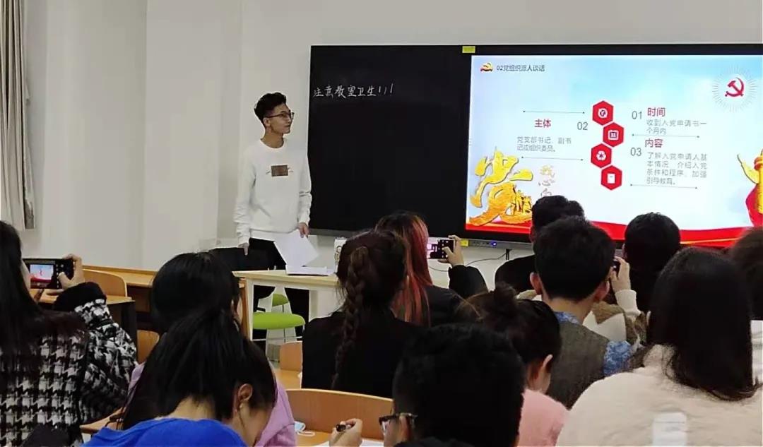 现代服务学院党总支书记黄中老师为同学们详细的介绍了中国共产党党章、中国共产党的指导思想以及党在经济、政治、文化、社会、生态建设上的权威性和指挥性。党的十九大把习近平新时代中国特色社会主义思想确立为我们党必须长期坚持的指导思想,黄老师教育同学们要深刻理解把握这一思想的科学体系、精神实质、实践要求,推动进一步兴起学习贯彻习近平新时代中国特色社会主义思想的新高潮,更加自觉地用习近平新时代中国特色社会主义思想武装头脑、指导实践、推动工作。