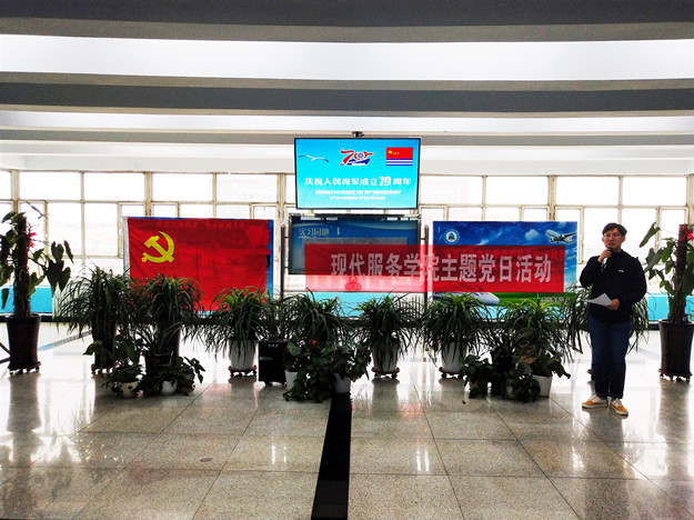为纪念中国人民海军成立70周年,4月23日下午,beat365正版唯一官方网站现代服务学院在主教学楼6楼大厅举办“逐梦深蓝·走向辉煌·人民海军·生日快乐”主题党日活动。