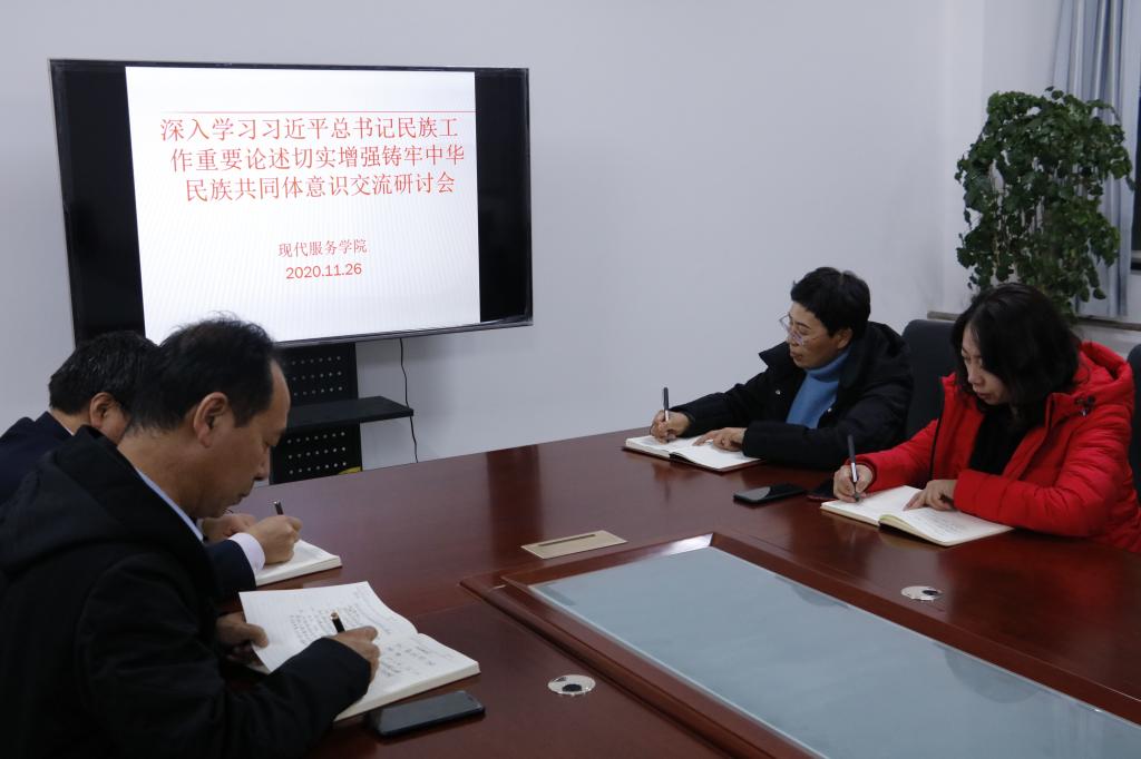 根据会议精神,现代服务学院领导班子在11月26日下午5点,进行学习习近平总书记民族工作重要论述切实增强铸牢中华民族共同体意识交流研讨会。