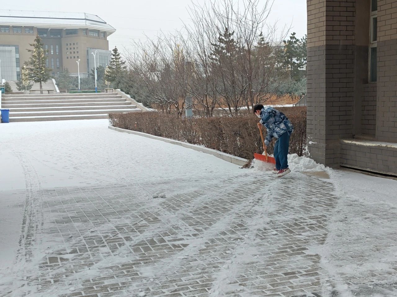 清扫过程中,同学们不畏严寒,拿着铁锹,扫帚,扫积雪,铲冰层,对校园道路进行集中清理。大家一边扫雪,一边提醒过往的同学小心行走,注意安全。所有人热情高涨,配合默契,团结协作,争分夺秒为老师同学清理出一条条“温暖通道”,一个个忙碌的身影俨然构成了冬日里一道靓丽的风景线。