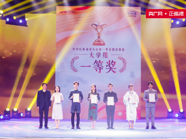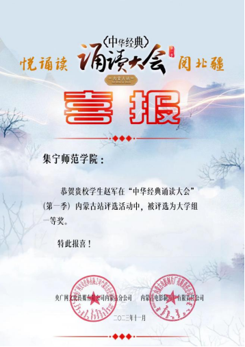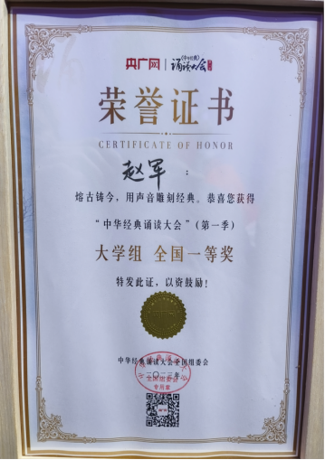 10月22日晚,由央广网主办的“中华经典诵读大会”(第一季)全国总展演暨颁奖盛典在湖北大冶圆满落幕。经过七个月的激烈角逐,beat365官网现代服务学院2021级播音与主持艺术专业学生赵军携作品《岳阳楼记》,在从内蒙古自治区赛区闯入全国总决赛的过程中,表现出色,最终荣获全国总展演大学组一等奖。
