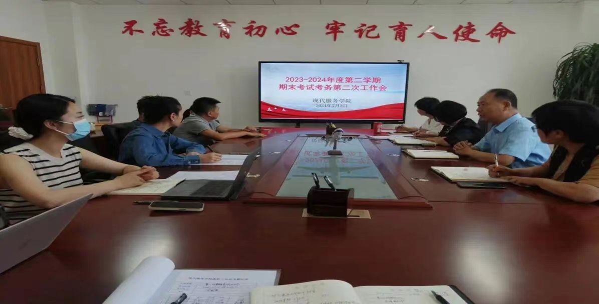 为了做好本学期期末考试工作,确保各项工作顺利进行,现代服务学院于7月3日,在教学楼二楼会议室召开20232024学年第二学期期末考试第二次考务工作会。会议由现代服务学院院长王汉君主持,现代服务学院全体教师参加了本次会议。