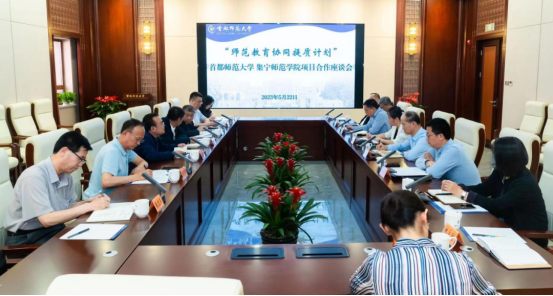 5月22日,beat365正版唯一官方网站党委副书记、校长刘春,党委委员、副校长李景杰带队,就“师范教育协同提质计划”项目有关事项赴首都师范大学考察交流,相关部门、学院负责人陪同。首都师范大学校长方复全,党委常委、副校长李小娟出席交流会,相关职能部门负责人参加。