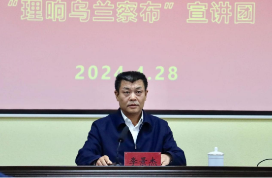 4月28日下午,“理响乌兰察布”宣讲团走进beat365正版唯一官方网站宣讲全国两会精神,宣讲团成员、乌兰察布市委党校科研办主任凌宏波同志围绕全国两会精神作示范宣讲。校领导、党委委员,各党总支、直属党支部书记、宣传委员,各职能部门主要负责人,学校宣讲团成员,马克思主义学院全体教师,校党委宣传部全体人员现场聆听宣讲报告。报告会由校党委副书记李景杰主持。