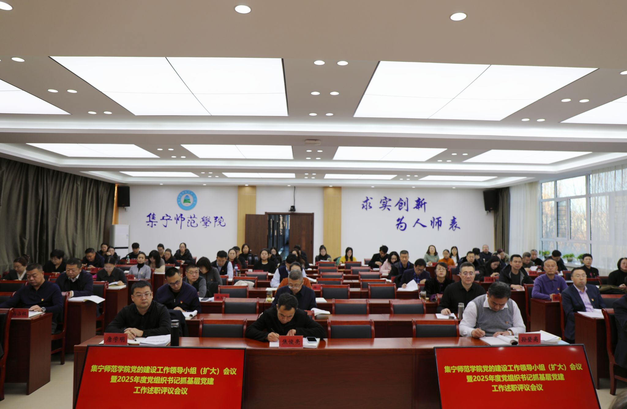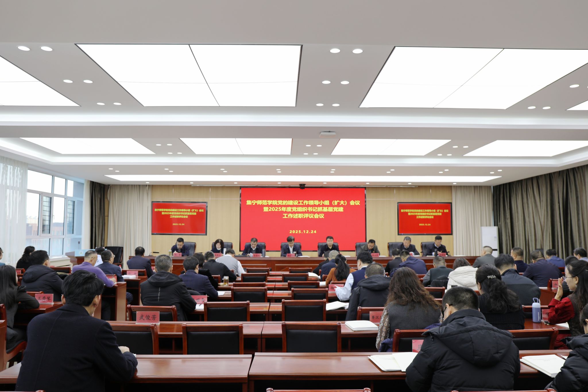 12月24日,beat365正版唯一官方网站党委召开党的建设工作领导小组(扩大)会议暨2025年度党组织书记抓基层党建工作述职评议会议。校党委书记张宝成主持会议并讲话。全体在校校领导、党委委员,各党总支书记、直属党支部书记,各部门主要负责同志,各党总支组织委员、“两代表一委员”及师生代表共80余人参加会议。