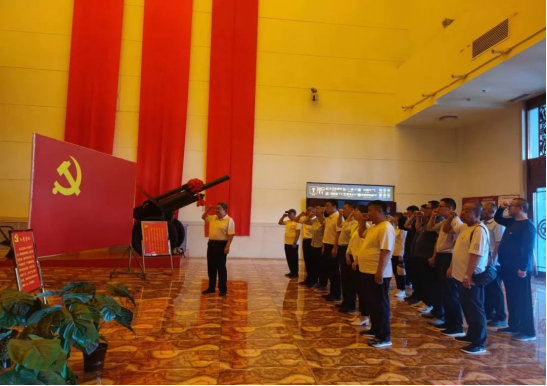 在纪念馆一楼大厅,学生工作部部长闫闳带领全体党员面向党旗宣誓,重温入党誓词,牢记自身责任和使命。
