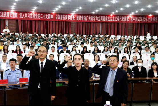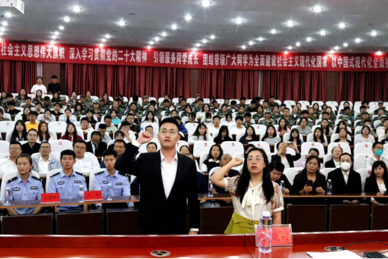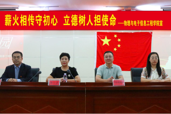 物理与电子信息工程学院党总支副书记张晓利带领新入职教师集体宣誓。他嘱托年轻老师们要全身心地投入教育事业,情系学生成长,做一名以德立身、以德立学、以德施教的好老师。