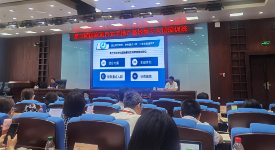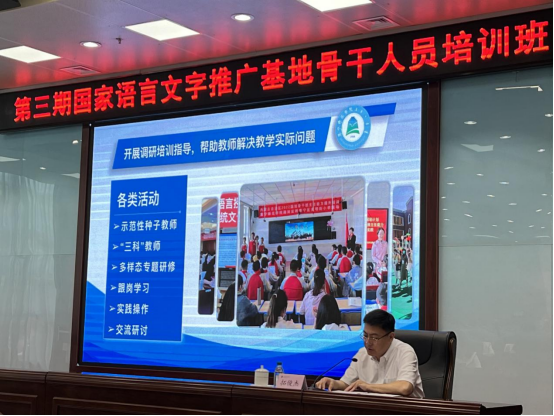 5月17日—21日,第三期国家语言文字推广基地骨干人员培训在国家教育行政学院举行,beat365官网党委委员、副校长、国家语言文字推广基地(beat365正版唯一官方网站)主任拓俊杰到会作经验交流。