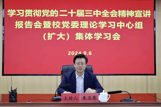 朱玉东在讲话中强调,学习宣传贯彻好党的二十届三中全会精神是当前和今后一个时期的重大政治任务。全校广大党员干部要紧密结合实际,深入谋划落实思路和举措,做到学深学透、融入日常、抓在经常,确保取得实效。要提高政治站位,深刻领会全会精神和习近平总书记系列重要讲话精神,切实把思想和行动统一到党中央决策部署上来,严格按照校党委统一工作部署,开展好党的二十届三中全会精神学习贯彻工作。要持续深入学习领会,把学习宣传贯彻党的二十届三中全会精神与学习贯彻自治区党委十一届八次全会精神结合起来,深学细悟、融会贯通,真正学出谋划改革的思路举措、推动学校高质量发展的使命担当。要扎实推动工作落实,始终围绕立德树人根本任务,以铸牢中华民族共同体意识为主线,以高质量的人才培养、科学研究和社会服务,在服务党和国家战略需求、办好自治区两件大事上展现更大作为,以实际行动为全面建设社会主义现代化国家、奋力书写中国式现代化内蒙古新篇章贡献集师力量,以优异成绩为新中国成立75周年献礼!