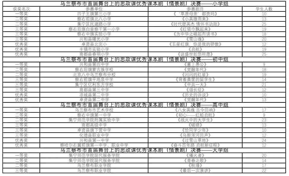 乌兰察布市首届“大思政课”舞台课本剧决赛圆满结束。此次活动不仅检验了思政教育工作的成果,更激发了师生的爱国热情,为培养德智体美劳全面发展的社会主义建设者和接班人奠定了坚实基础,达到了预期效果和积极影响。