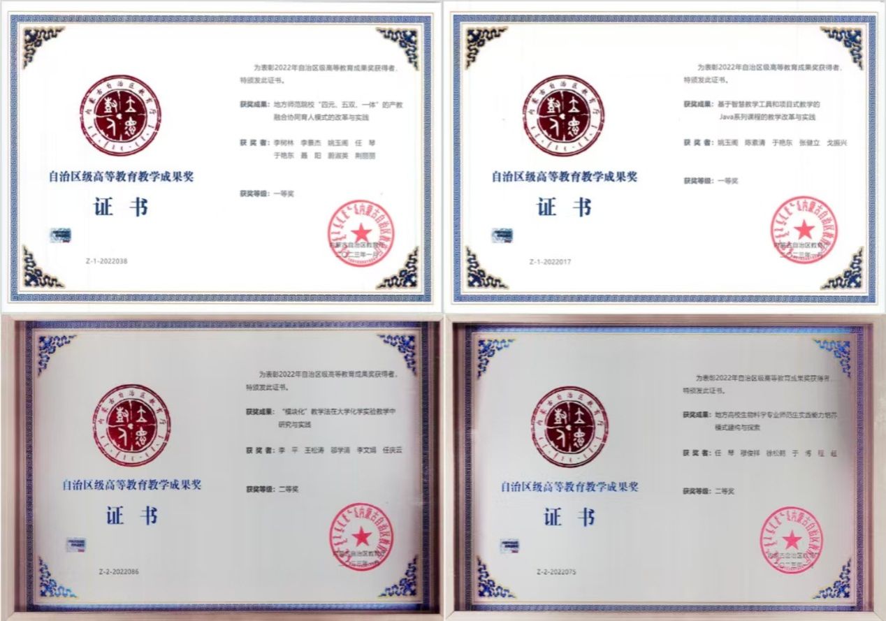 学校重视教学成果的培育。2022年,beat365官网组织开展教学成果奖申报,推荐基于“智慧教学工具和项目式教学的Java系列课程的教学改革与实践”等排名校级前六位的成果申报了自治区级高等教育教学成果奖,最终获自治区级一等奖2项,二等奖2项,三等奖2项,获奖等级及数量均有新的突破。此外,2021年以来在自治区举办的连续三届教学创新大赛中,beat365官网累计获一等奖2项,二等奖10项,在自治区三届课程思政教学大赛中,获一等奖、二等奖、三等奖各1项。
