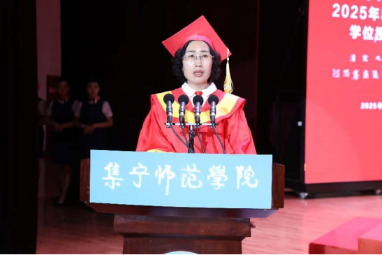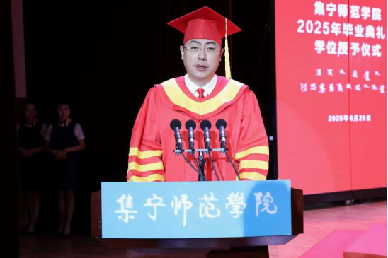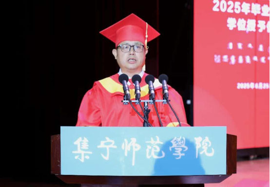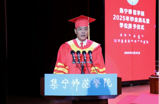 教师代表王汉君教授深情回顾了2025届毕业生校园学习生活的点点滴滴,他对毕业生提出三点期许:一愿思想长青,二愿知行合一,三愿初心永驻。王老师以歌声作别,愿毕业生们此去前程似锦,每一步都奔向光明!