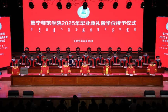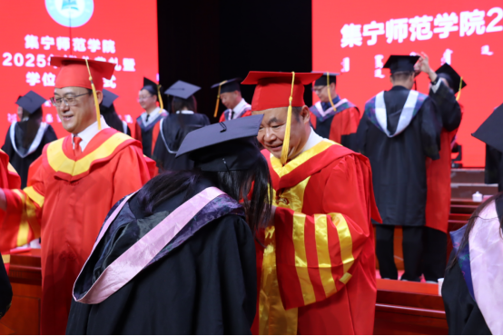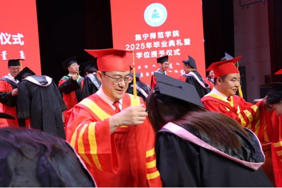 李景杰宣读校级优秀毕业生名单,李凤斌宣读2025届优秀学士学位论文名单,拓俊杰宣读毕业生名单及授予学位学生名单。主席台领导为毕业生代表颁发优秀毕业生荣誉证书、毕业证书和学位证书,并为毕业生拨穗正冠。