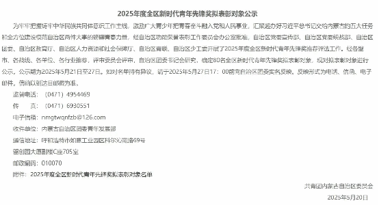 为牢牢把握铸牢中华民族共同体意识工作主线,激励广大青少年把青春奋斗融入党和人民事业,汇聚起办好习近平总书记交给内蒙古的五大任务和全方位建设模范自治区两件大事的磅礴青春力量,经自治区功勋荣誉表彰工作委员会办公室批准,自治区党委宣传部、自治区党委统战部、自治区团委、自治区教育厅、自治区人力资源和社会保障厅、自治区青联、自治区少工委开展了2025年度全区新时代青年先锋奖推荐评选工作。