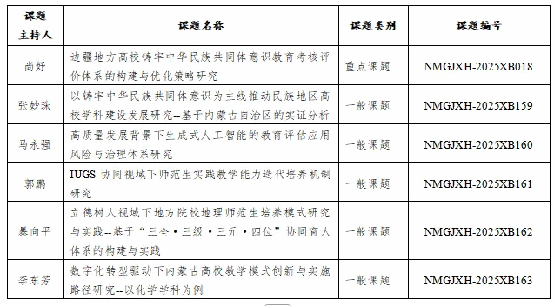 根据6月13日内蒙古自治区高等教育学会《关于公布2025年高等教育研究立项课题的通知》,beat365官网6项课题获批立项,其中1项为重点课题。具体立项信息如下: