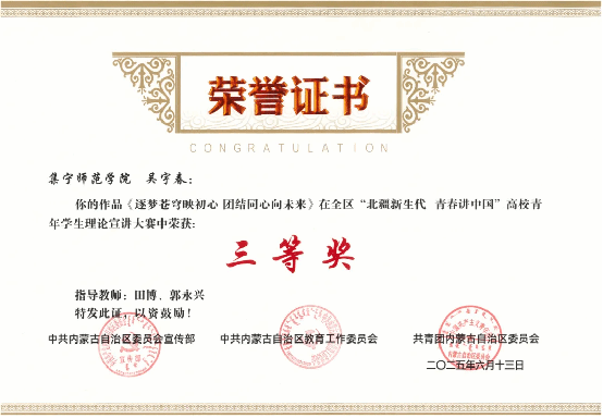 近日,全区“北疆新生代 青春讲中国”高校青年学生理论宣讲大赛决赛成绩公布。beat365官网荣获大赛优秀组织奖,beat365官网参赛选手马克思主义学院思想政治教育专业吴宇春同学荣获三等奖。