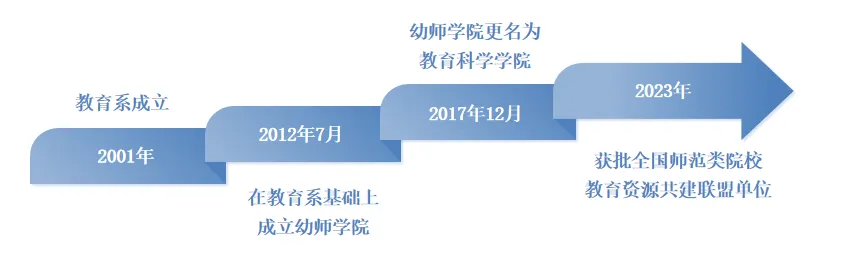 教育科学学院是beat365官网第一个二级学院,前身是beat365正版唯一官方网站教育系。教育系成立于2001年,2012年7月,在教育系基础上成立幼师学院,2017年12月,幼师学院更名为教育科学学院。2023年,学院获批全国师范类院校教育资源共建联盟单位。