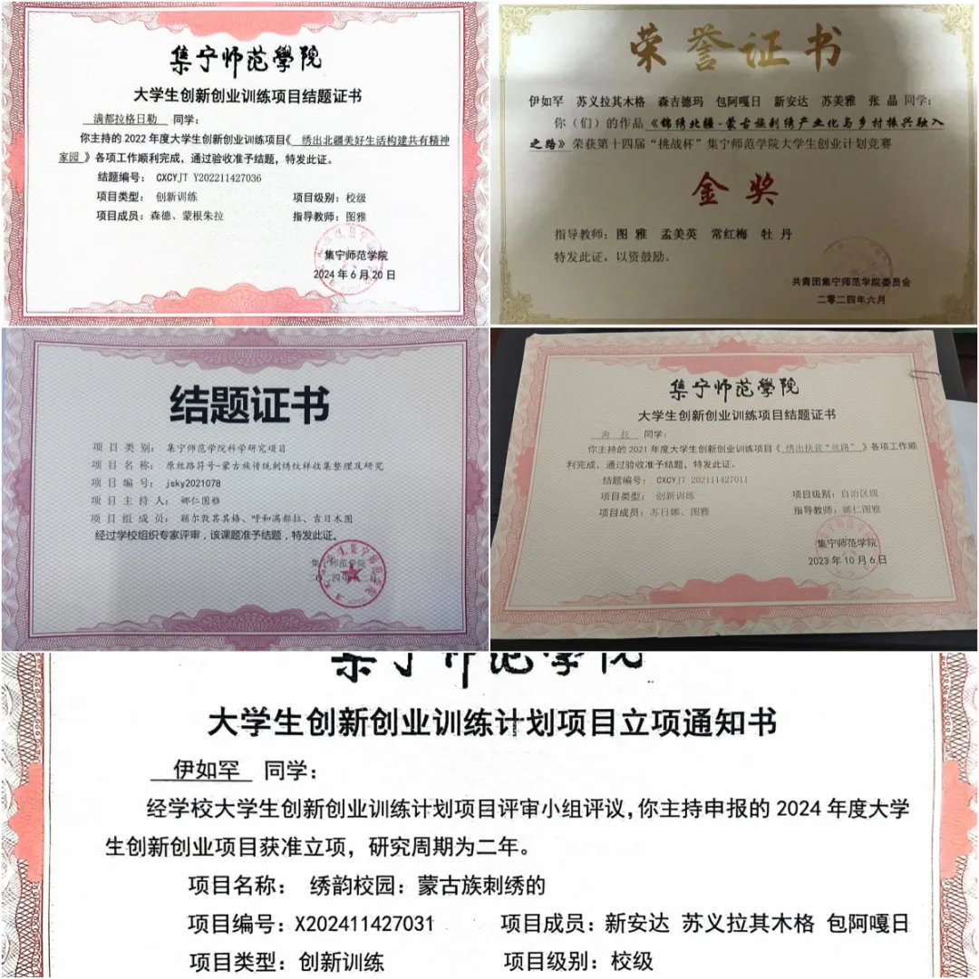 依托该特色课程平台,2019年“蒙古族传统刺绣”项目荣获全国移动互联创新大赛华北赛区高校组二等奖和全国移动互联创新大赛总决赛高校组二等奖。