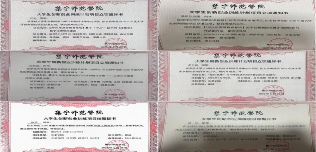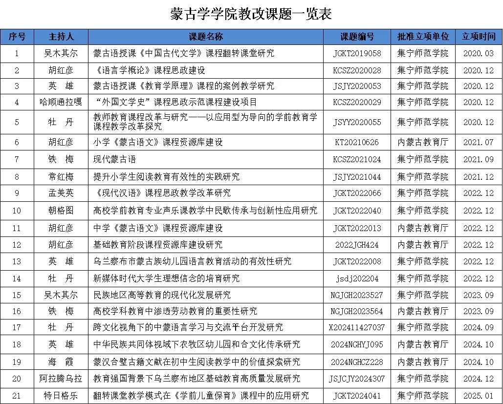 近五年,立项教改课题 21 项、科研课题 28 项,博士基金项目 9 项。教改课题聚焦教学理念创新、教学方法改革以及课程体系优化等关键领域,旨在提升教学质量与人才培养水平。科研课题涉及蒙古语言文化、历史文献、民俗艺术等多个学科方向,深入挖掘蒙古学的丰富内涵与独特价值。博士基金项目为青年学者提供广阔的学术研究平台,推动学科前沿领域的探索与突破。