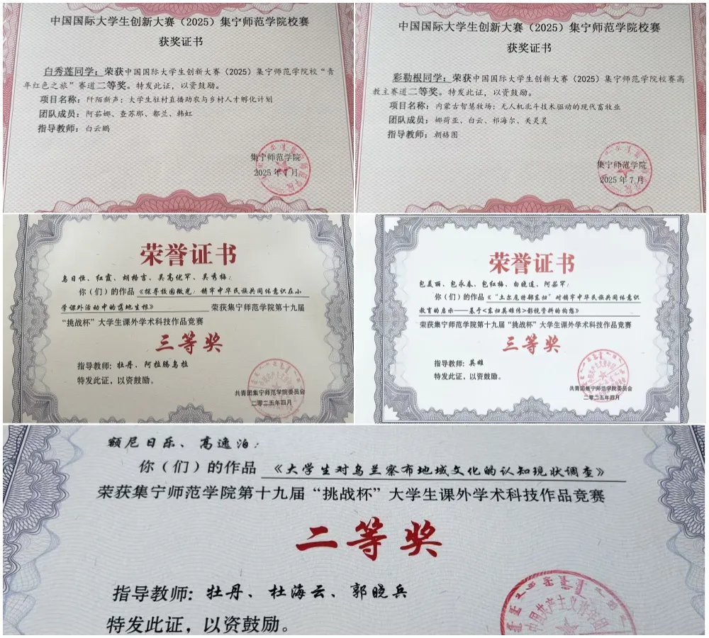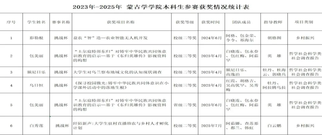 近三年,学院累计开展“三下乡”“返家乡”等活动87项,参与200余人次,覆盖内蒙古全域及辽宁等地,形成“团队+个人”的实践模式。获批国家级、自治区级大创项目16项,“基于马文化的幼儿玩具设计”获自治区级立项,“蒙古族刺绣AR可视化”等5个项目获自治区级专项资助。获“挑战杯”大学生课外学术科技作品竞赛省级二等奖1项、校级奖项5项。“互联网+”大学生创新创业大赛项目入围省级决赛。通过以赛促学、以研促创,有效提升了学生实践创新能力。