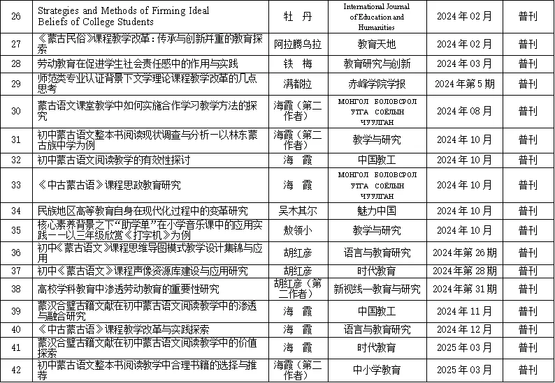 近五年,学院教师在国内外学术期刊上发表论文共 94 篇,其中教改论文 42 篇、科研论文 52 篇,核心论文 11 篇。涵盖蒙古学多个分支领域,从语言的结构与演变、文学的创作与批评到教育教学的理论与实践,进行深入细致的研究与探讨。
