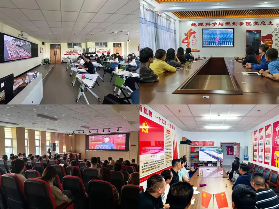 学校领导班子在行政楼402会议室集中观看。各职能部门、二级学院及附中组织师生分别在会议室、教室等场所共同观看。观看过程中,当空中护旗梯队、徒步方队、战旗方队、装备方队、空中梯队在屏幕前依次亮相时,大家情不自禁地鼓掌,为祖国的强大军事力量和国防建设成就深感骄傲与自豪。