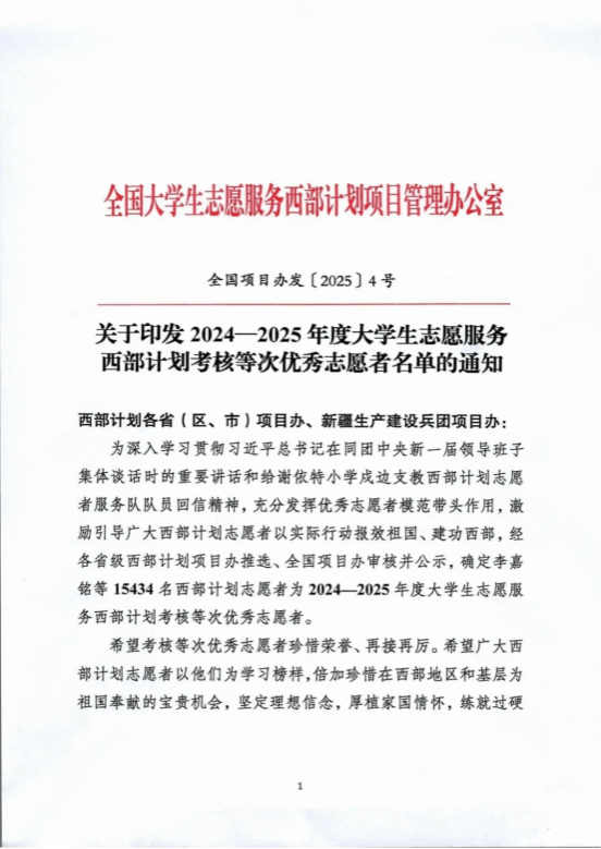 近日,全国大学生志愿服务西部计划项目管理办公室公布了2024—2025年度大学生志愿服务西部计划考核等次优秀志愿者名单,beat365官网31名志愿者凭借出色的表现、扎实的工作和无私的奉献,荣获“优秀志愿者”称号。这不仅是他们个人的荣耀,更是beat365正版唯一官方网站的骄傲,彰显了beat365官网在志愿服务领域的卓越成果和育人成效 !