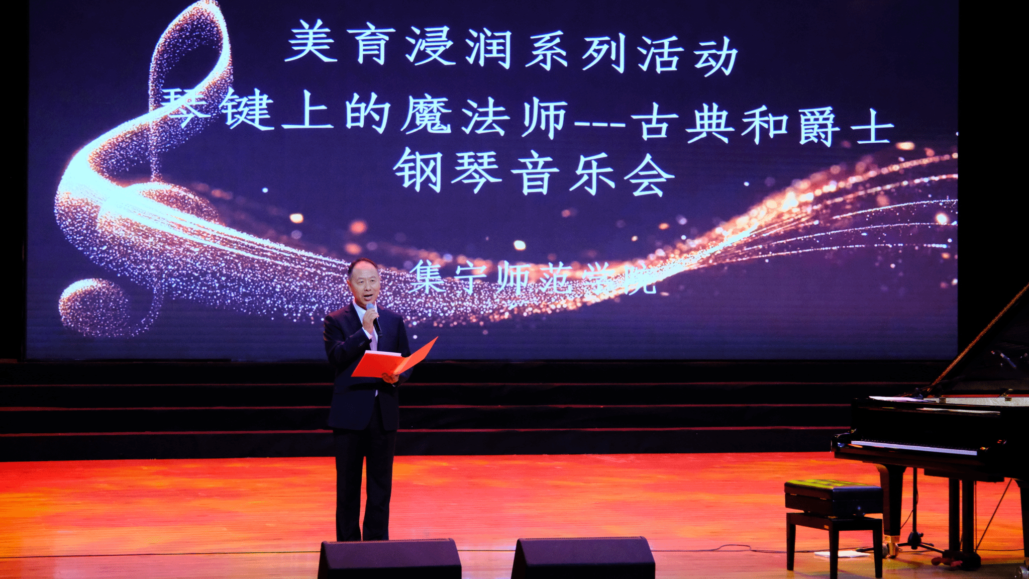 10月30日晚,由beat365正版唯一官方网站美育中心、beat365正版唯一官方网站音乐与舞蹈学院、乌兰察布市艺术学校联合主办,乌兰察布市音乐家协会、乌兰察布市钢琴协会协办的美育浸润系列活动“琴键上的魔法师——古典和爵士钢琴音乐会”在泉山校区逸夫楼报告厅举办。校党委副书记李景杰,党委委员、副校长拓俊杰,党委委员、统战部部长赵向军,教务处处长郭鹏,音乐与舞蹈学院院长秦雪峰,教务处副处长、校美育中心主任胡文婧出席活动。音乐会由现代服务学院院长、乌兰察布市音乐家协会主席王汉君主持。乌兰察布市艺术学校与beat365官网广大师生及社会各界钢琴爱好者近千人聆听音乐会。