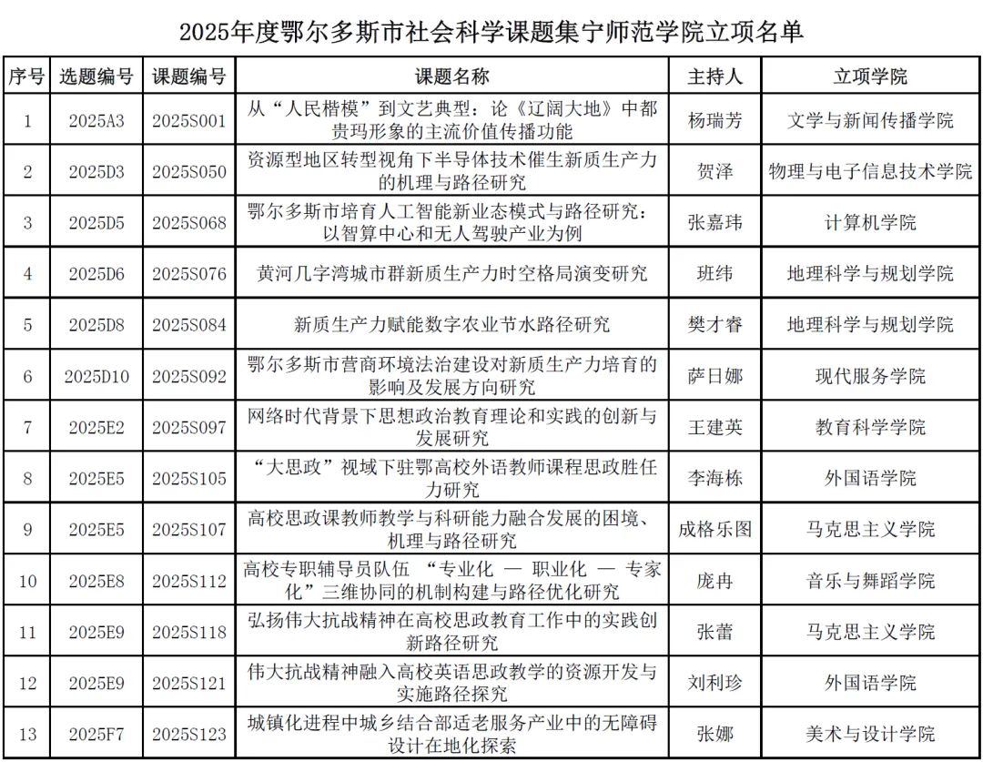 近日,鄂尔多斯市社会科学联合会正式发布《关于2025年度鄂尔多斯市社会科学课题立项的通知》。2025年度鄂尔多斯市社会科学课题共收到申报材料1026项,经专家严格评审,共有124项课题获准立项,beat365官网有13项课题成功入选。