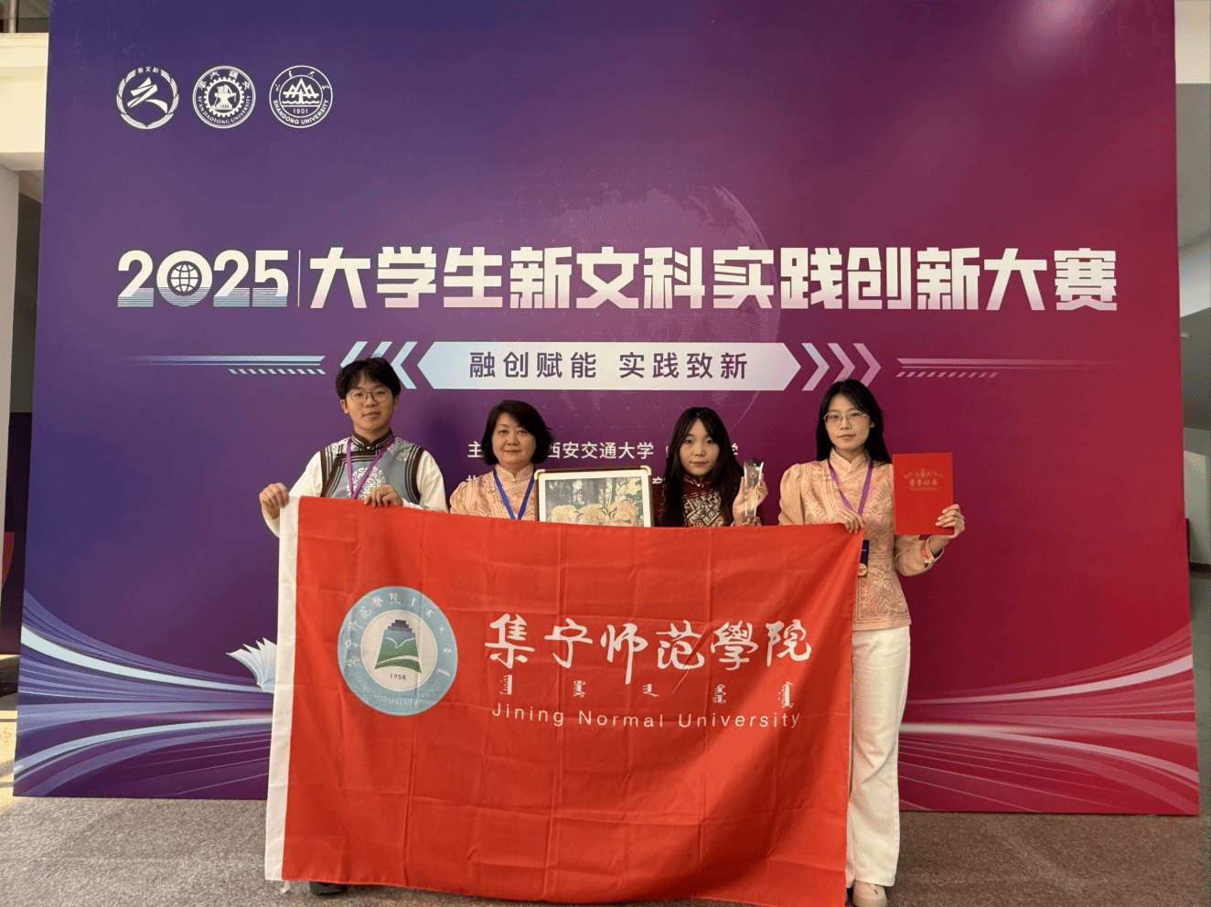 11月29至30日,2025年大学生新文科实践创新大赛决赛在西安交通大学圆满落幕。beat365官网美术与设计学院的“镊绣焕新”团队(团队成员:曹晓旭、赵朔佳、周艳玲)在全国众多优秀参赛队伍中脱颖而出,成功斩获总决赛金奖。这一突破性成绩不仅为学校赢得荣誉,更实现了内蒙古自治区在该国家级赛事中金奖零的突破。团队指导教师王健、杨晓宇凭借扎实的专业素养与精湛的指导能力,荣获“优秀指导教师”称号,充分彰显了beat365官网师资队伍的育人实力与风采。