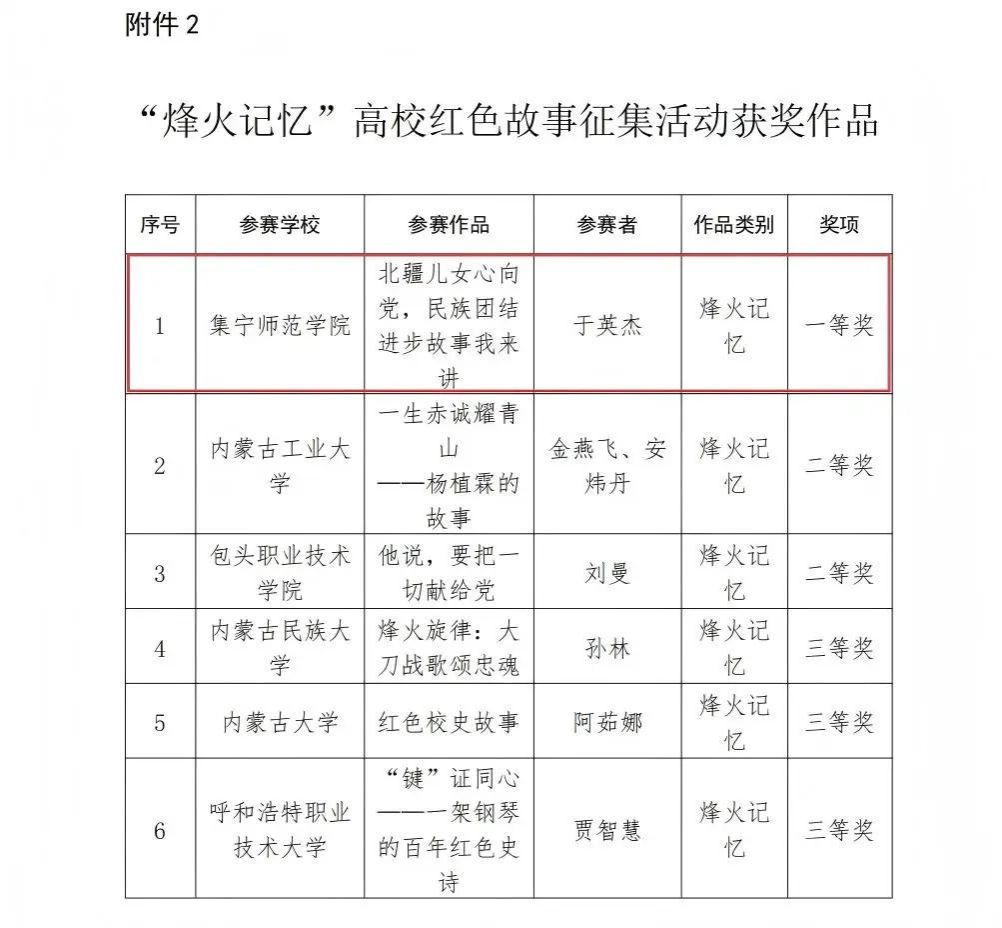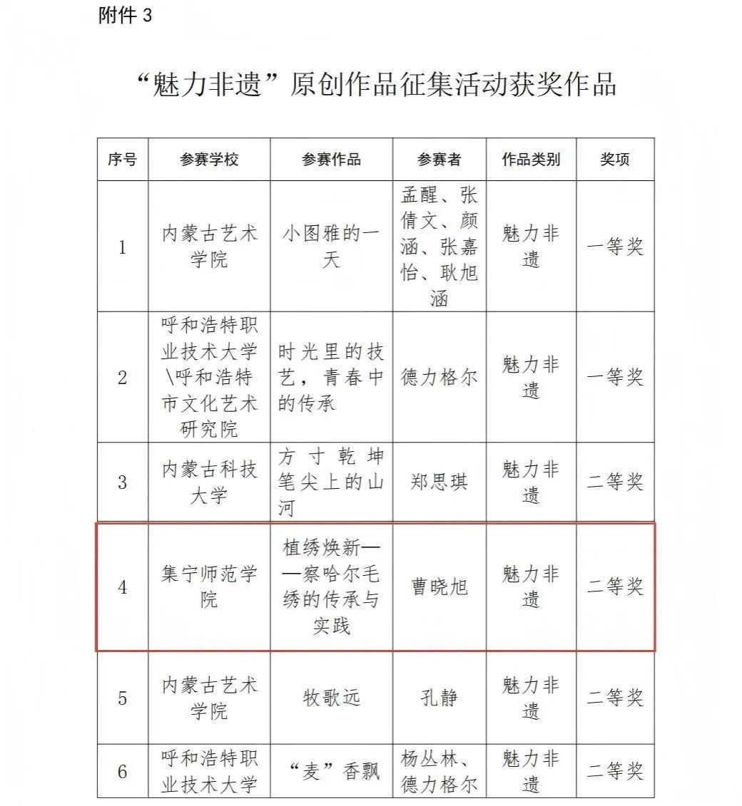 近日,内蒙古自治区教育厅发布《关于全区高校“礼敬中华优秀传统文化”宣传教育活动评选结果的公示》,在各高校推荐、专家评审的严格遴选环节中,beat365官网党委宣传部组织申报的两件作品得到评审专家的一致认可,成功在两大类别中斩获奖项:于英杰创作的《北疆儿女心向党,民族团结进步故事我来讲》荣获“烽火记忆”高校红色故事一等奖,曹晓旭创作的《植绣焕新——察哈尔毛绣的传承与实践》荣获“魅力非遗”原创作品二等奖。