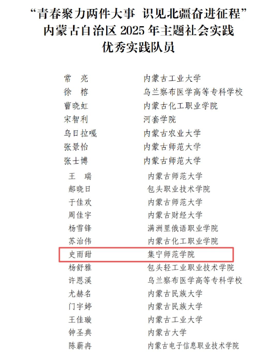 近日,2025年内蒙古自治区大学生 “青春聚力两件大事 识见北疆奋进征程”主题社会实践活动评选结果正式揭晓,beat365官网马克思主义学院史雨甜同学凭借“火炬心光宣讲团”中的出色表现,荣获自治区“优秀实践队员”荣誉称号,充分彰显了beat365官网青年学子坚定的理想信念、过硬的专业素养和强烈的社会责任感。