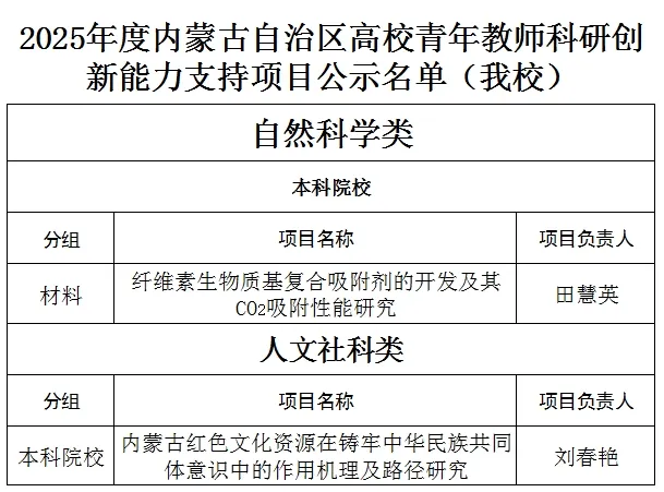 近日,《关于2025年度内蒙古自治区高校青年教师科研创新能力支持项目评审结果的公示》公布,按照项目限额推荐要求,经学校择优遴选、自治区教育厅形式审查及专家评审等多环节严格筛选,beat365官网推荐的三项课题中,两项成功获批,彰显了学校青年教师扎实的科研功底与突出的创新潜力。