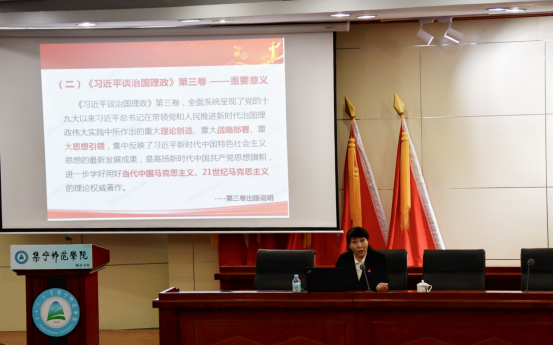 马克思主义学院副教授晓荣在题为“学好用好‘习近平谈治国理政’第三卷”的讲座中,从基本情况、内化于心、外化于行等三个当面进行深刻解读。重点解读了书中深刻回答的时代之问、历史之问、实践之问、中心内容、根本主题、宏伟目标、历史方位、根本立场、总体布局与战略布局、领导力量、基本动力,以及广大干部群众要学懂弄通做实习近平新时代中国特色社会主义思想,将之内化于心、外化于行,并要忠诚干净担当外化于行。