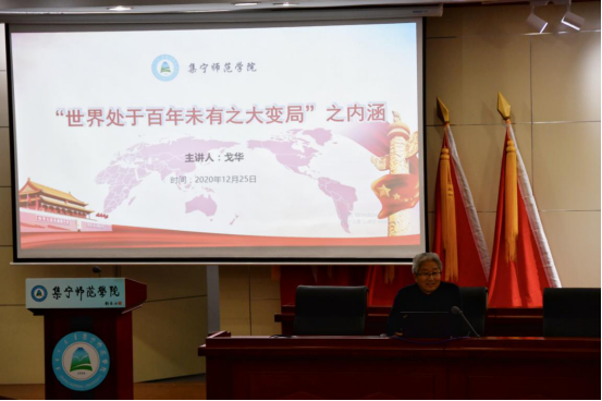 马克思主义学院党总支书记戈华在题为“‘世界处于百年未有之大变局’之内涵”的讲座中,从世界大变局、中国之变、中国怎么办三方面进行讲解,阐释了中国是变局发生发展的重要因素,准确把握这一大变局的丰富内涵和发展趋势,以正确的历史观、大局观、角色观来看待中国与世界,稳妥应对变局、抓住战略机遇期。