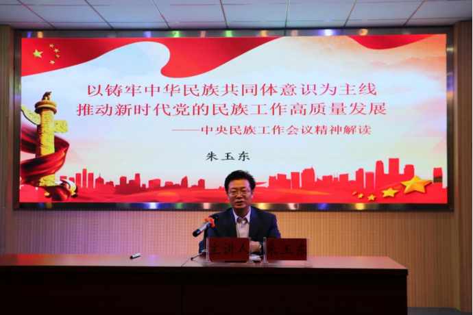 讲座中,朱玉东就历史脉络、核心要义、实践要求三个主题进行了深入的阐述。以习近平总书记强调的,“回顾党的百年历程,党的民族工作取得的最大成就,就是走出了一条中国特色解决民族问题的正确道路。”以“十二个必须”、中华民族大家庭、中华民族共同体、铸牢中华民族共同体意识等内容串联,为老师、同学们传达了中央民族工作会议精神。
