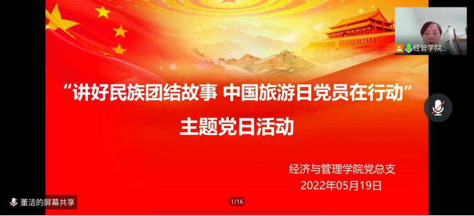 为全面贯彻习近平总书记关于加强和改进民族工作的重要思想,深入推进“民族政策宣传月”活动的开展,5月19日,经济与管理学院党总支通过线上方式举办“讲好民族团结故事 中国旅游日党员在行动”主题党日活动。全体师生党员参加了本次活动。