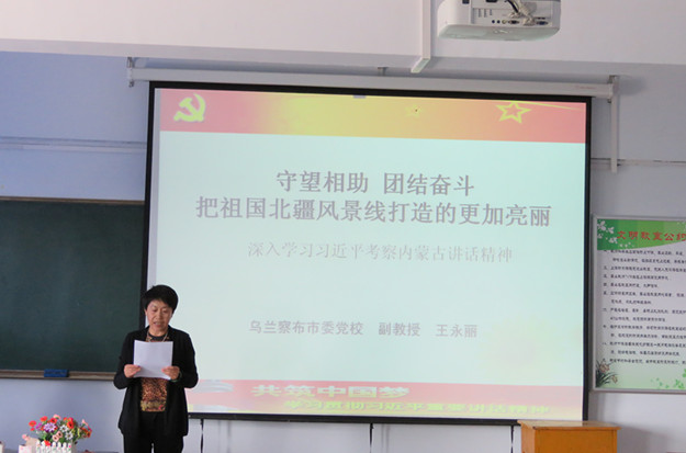 讲座中,王永丽主要从学习习近平总书记考察内蒙古讲话精神的重大意义和精神实质;介绍自治区各级领导如何贯彻落实习总书记的重要讲话精神,以及习总书记的讲话对内蒙古自治经济发展起的指导作用两个方面进行讲解。