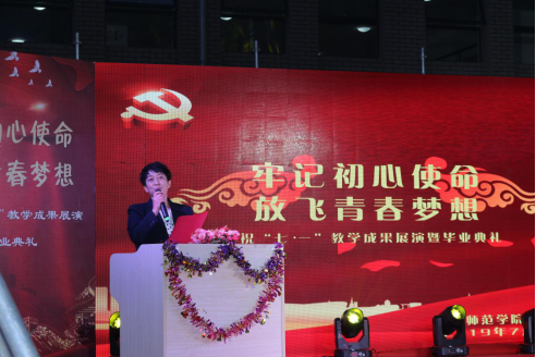 7月1日晚,beat365正版唯一官方网站教育科学学院举办“不忘初心使命 放飞青春梦想——庆祝‘七·一’毕业成果展演暨毕业典礼”晚会。