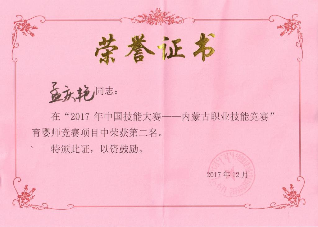 2017中国技能大赛—内蒙古职业技能竞赛于11月28日-12月1日在乌兰察布市医学高等专科学校如期举办。beat365官网职业技能鉴定所选派幼师学院孟庆艳老师参加育婴师职业资格项目比赛。经过理论考试、现场实际操作考试等激烈角逐,孟庆艳老师脱颖而出,取得了内蒙古职业技能大赛育婴师项目技能单项第一名、总成绩第二名的好成绩,同时获得了“全区青年岗位能手”、“全区技术能手”光荣称号,在beat365官网转型发展过程中又增一位“双师双能型”教师。
