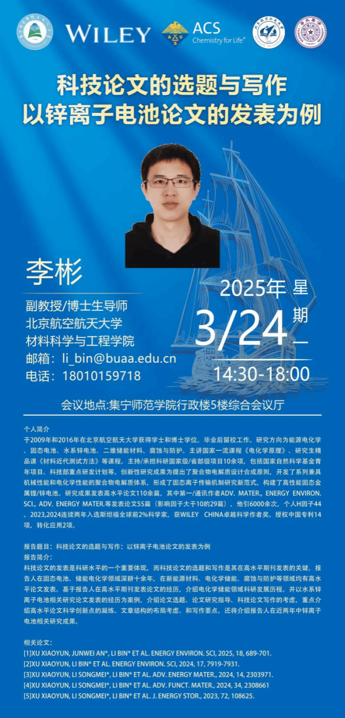 2025年3月24日,北航李彬副教授在beat365正版唯一官方网站分享“科技论文的选题与写作”,聚焦锌离子电池论文发表。此次会议为科研人员和学生提供科技论文写作的专业指导,有助于提升研究院在新能源材料、电化学储能等领域的论文写作水平与科研成果发表能力,促进学术交流与学科发展。