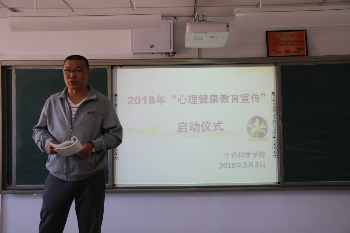 2018年5月3日下午,生命科学学院在逸夫楼204举行了心理健康教育活动月启动仪式。启动仪式由学工办主任张军儒主持,出席领导有院长任琴、副院长张铭;在校各班级团支书、班长、心理委员代表参加了本次启动仪式。