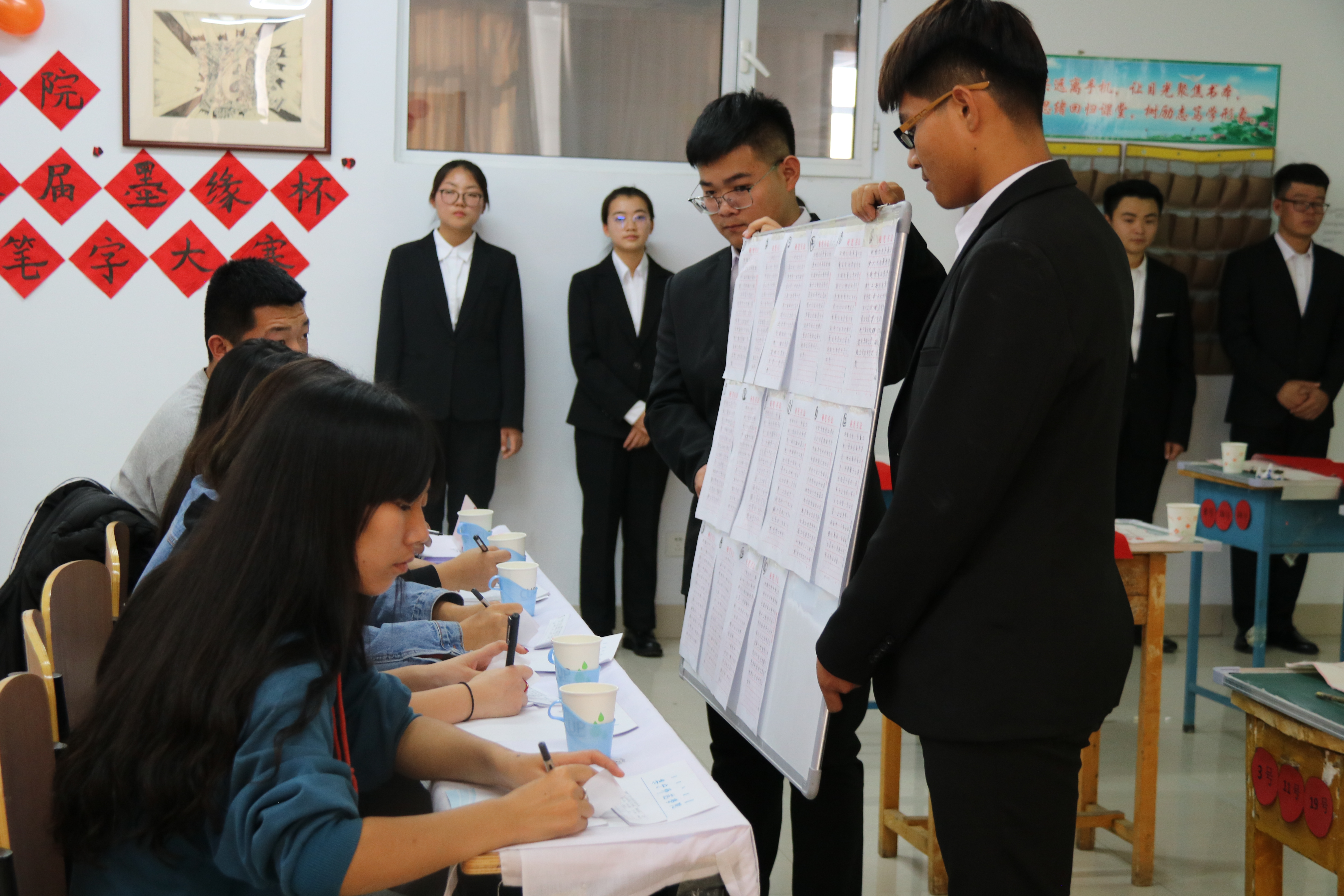 为弘扬优秀传统书写艺术,增强大学生写好三笔字意识,提高书写三笔字技能,生命科学学院于2019年10月31日14时在逸夫楼109室成功举办第八届“墨缘杯”三笔字大赛。担任本次大赛的评委有物理学院学生会主席马焱峰、化学与化工学院学生会主席李文杰、现代服务学院学生会主席于红飞、经济与管理学院学生会副主席王亚楠和计算机学院学生会副主席何爽。出席本次大赛的嘉宾为各院代表。
