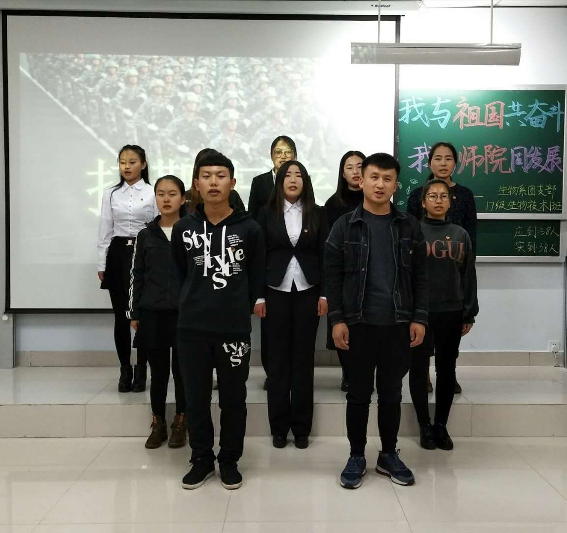 为了积极响应十九大的召开,更好地宣传爱国主义精神,加深同学们对祖国和学校的了解,展现同学们的民族精神,爱国风貌。生物系团总支组织17级生物技术团支部于2017年11月2日下午五点三十分在逸夫楼201教室,举办了主题为“我与祖国共奋斗,我与师院同发展”的主题团日活动。