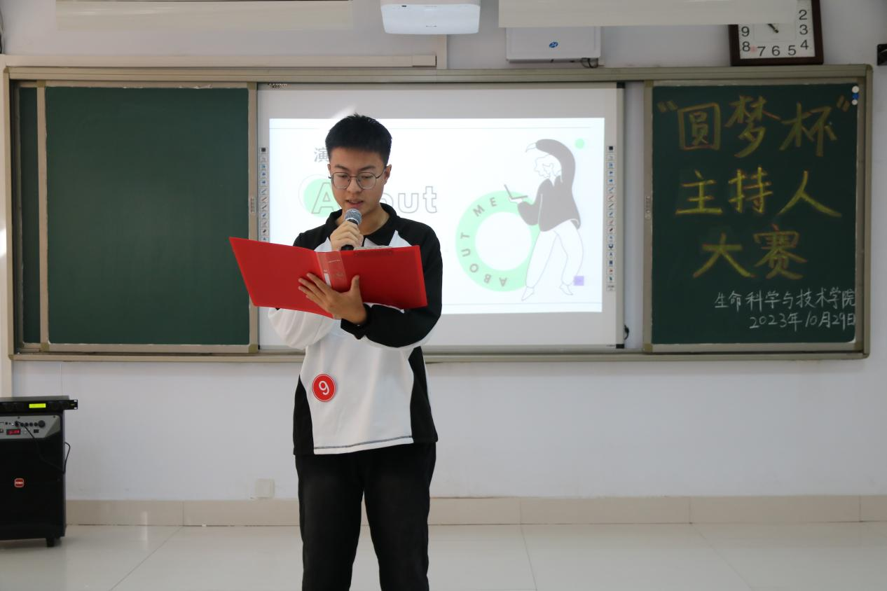 为深入学习贯彻党的二十大精神和习近平新时代中国特色社会主义思想,坚定不移推广普及国家通用语言文字,不断提高学生人文道德素养,充分展现学生青春风采,生命科学与技术学院于2023年10月29日在逸夫楼209室举办第十四届“圆梦杯”主持人大赛。担任本次大赛的评委有物理与电子信息工程学院学生会执行主席施慧波和主席团成员董俊杰,以及生命科学与技术学院团总支副书记张慧、青协分会会长侯佳雪、主席团成员金轩宇,我院学生会全体成员和学生代表观看了本次比赛。