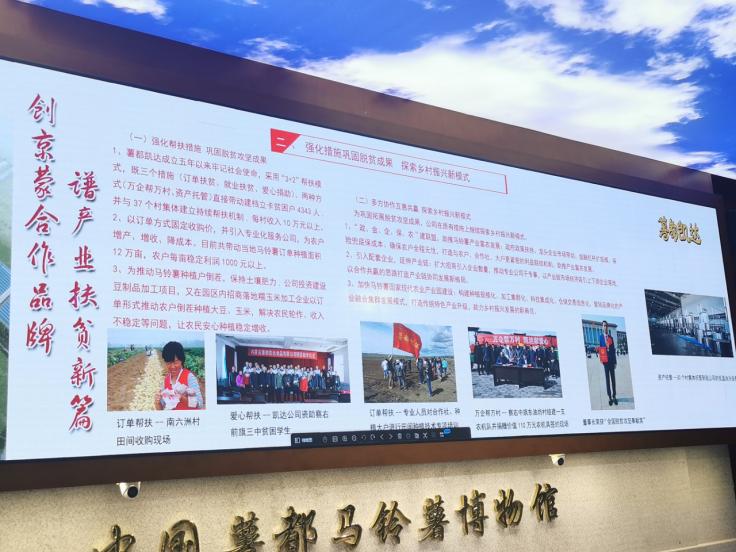 走访调研组听取了薯都凯达食品有限公司生产经营发展、产品外销和人才招聘等情况介绍,参观了中国薯都薯文化博物馆和观光科普走廊流水线生产模式,了解了薯都凯达作为京蒙合作重点企业,积极参与精准扶贫工作,全力承担社会责任,用文化引领马铃薯产业发展,铸就薯都文化载体,积淀薯都文化底蕴,将马铃薯推向全世界的企业理念。双方交流了马铃薯新品种培育、机械操作等方面人才需求、选聘机制等情况。