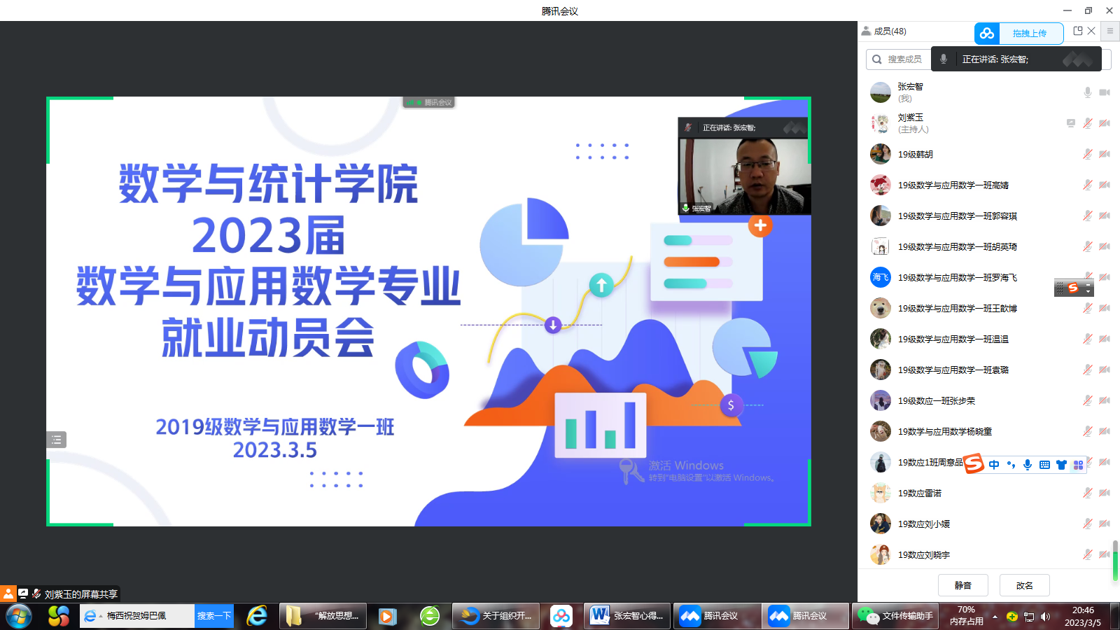 3月5日晚,数学与统计学院召开了2023届数学与应用数学专业毕业生就业动员会,学院党总支书记张宏智、班主任刘克兰、辅导员刘紫玉和2023届数学与应用数学专业全体毕业生参加了本次动员会。