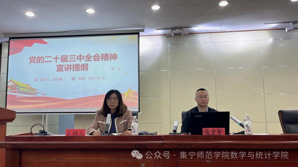 为全面贯彻落实习近平新时代中国特色社会主义思想,深入学习贯彻党的二十届三中全会精神,9月26日,数学与统计学院在图书馆报告厅开展党的二十届三中全会精神宣讲报告会。学院党总支书记张宏智为本次报告会作宣讲。报告会由学院党总支副书记常鑫主持,数学与统计学院全体在校学生参加了报告会。